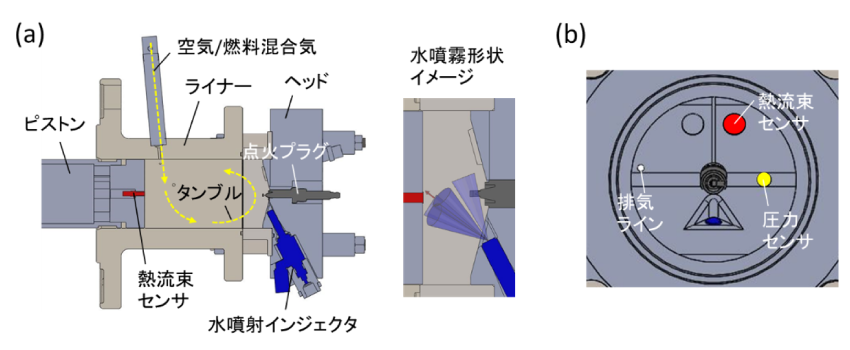 空気過剰率λを2程度まで上げた超希薄燃焼ガソリンエンジンに筒内水噴射を組み合わせることにより、52%を超える高い図示熱効率を実現できる。この際、水をピストン頂面付近に層状に分布させることで、超希薄燃焼においても燃焼を悪化させることなく水の冷却効果を得ることが可能となる。本技術の高度化と更なる熱効率向上に向けては、水噴射が燃焼や温度場、壁面熱伝達に与える影響を詳細に解明すると共に、筒内水分布を最適化することが求められる。本記事ではエンジン燃焼を1サイクル模擬可能な急速圧縮膨張装置を用いた、水噴射下における燃焼・熱伝達特性の解明と、噴射方向の変更による水分布最適化に向けた検討結果について紹介する。