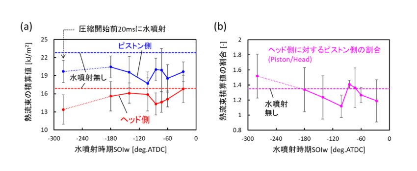 水噴射条件下における燃焼・熱伝達現象を詳細に調べるため、エンジン燃焼を1サイクル模擬可能な急速圧縮膨張装置(RCEM)を用いて実験を行った(3)。図1に示すように、燃焼器には水噴射インジェクタを取り付け、空気/燃料混合気はライナ側面より導入することにより、筒内に実機エンジンと同様のタンブル流を形成した。実験時には筒内圧に加えて、ピストン中央部とヘッド下面に設置された同軸型薄膜熱電対センサにて壁面熱流束を計測した。図2(a)はλ=2における壁面熱流束の時間積分値を水噴射時期SOIwに対してプロットしており、図2(b)はこれをヘッド側に対するピストン側の割合になおしている。これより水噴射による熱流束低減効果は全体的にピストン側の方が大きく、またヘッド側に対するピストン側熱流束時間積分の割合は、圧縮開始前噴射から-102 deg.ATDCまでは水噴射タイミングを遅らせるに従って単調に減少する。これより、水噴射タイミングの遅角によってピストン表面の水蒸気成層化が促進されると考えられる。