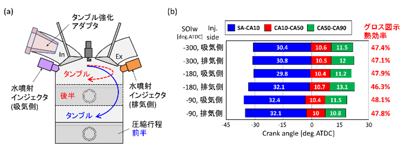 水分布の最適化による水蒸気成層化の促進を目的とし、水噴射方向が単気筒エンジン性能に与える影響を調査した(4)。図3(a)に示すように、吸気側噴射の場合、圧縮行程前半に水噴射を行うことで水はタンブル流に乗って吸気側からピストン表面近くに輸送され、成層化される。一方圧縮行程後半においてタンブル流はピストン運動方向に押しつぶされるため、排気側から水噴射を行う方が吸気側からと比較して成層化しやすいと考えられる。また排気側・圧縮行程後半噴射は、吸気側・圧縮行程前半噴射と比較して点火時期に近いタイミングでの水噴射となり、より強い成層化状態を保ったまま燃焼へと移行できる可能性がある。以上の観点のもと、同一燃焼重心における吸気側・排気側噴射の燃焼期間および図示熱効率を比較したものが図3(b)である。SOIw = -300 deg.ATDCの場合は噴射方向の影響はほとんど見られず、SOIw = -180 deg.ATDCの場合は吸気側噴射と比較して排気側噴射は熱効率が約1.7pt.低下し、燃焼期間も長期化する。一方SOIwを-90 deg.ATDCまで遅角すると、両者の熱効率の差は再び小さくなり、排気側噴射の燃焼期間は吸気側噴射と比較して短縮される。現時点では明確なエンジン性能向上には至っていないものの、水噴射時期を遅角した際に排気側噴射の優位性が現れる傾向が確認できる。