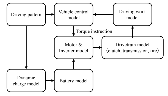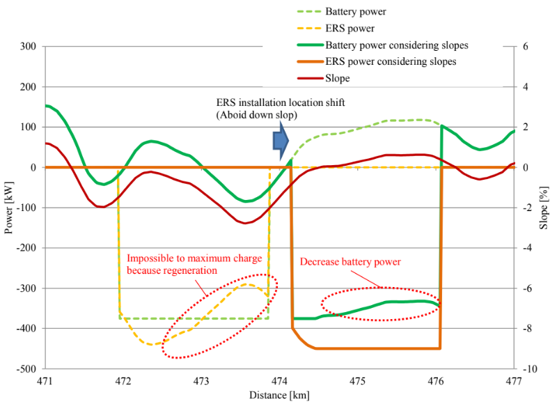 島村ら(1)は、電池の制約から実施が困難とされている長距離輸送用貨物車の電動化を促進するために、高速道路に450kWの接触式給電インフラ(ERS)を設置する際の必要設置長さについて、図1のシミュレーションで検討した。東京-大阪間の高速道路を利用して貨物車(総重量25t)で一定のパターン(一般路:50km/h、高速:80km/h)で配送作業を実施した際に、各IC間の中央付近に1区間のERSを設置する方法を採用する仮定で、高速道路走行分の給電を完結出来る(電池のSOCが高速道路走行後に上昇する)のに必要なERSの長さを求めた。このERS設定で前述のシミュレーションを実施し、各IC間でのSOC上昇量を確認した。その結果、一部に充電不足の区間があり、この原因がERS区間の下り坂での回生制動時の充電阻止であることを確認し、下り坂を避けた設置位置に移動することで、図2のように良好な充電が確認できた。また、上り坂での電池の負荷も軽減されるとしている。