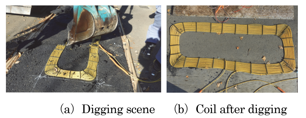 一方、非接触給電システムであるDWPT(Dynamic Wireless Power Transfer)は種々の未解決の課題を抱えてはいるものの、既に停車中給電で規格化されている磁界結合型の実用を前提とした研究も盛んになっている。居村ら(2)は、上記の接触式と同様高速道路に敷設する際の経費について、フォローアップ可能性に重点を置いた検討を紹介した。システムの細かい選択肢とその特徴について解説(例えば、大型/小型車への対応方法:図3)した上で、種々の選択肢での初期導入コスト、運用時の保守等のランニングコスト、設備更新時のコスト等をできるだけ積み上げる形で紹介している。また、コストの高いコイルに関しては、アスファルト舗装では図4に示すように掘り出しが可能で、再利用可能性が確認済みであることから、コスト低減が期待できるとしている。