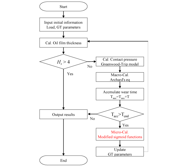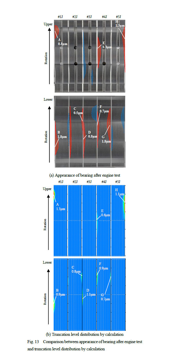 大豊工業の倉部ら(2)からは、初期なじみにより変化していく軸受の摺動面形状を逐次反映させることで、なじみ後の軸受表面形状や摩耗量を精度よく予測する計算手法が紹介されている。図4に計算のフローを示す。従来はなじみ後の摺動面形状を予測して油膜の計算を行う等の方法が採られていたが、本手法では、まず軸受の初期形状により混合潤滑を考慮した油膜の計算を行い、これにより求められた真実接触部の圧力を用いて摩耗深さを計算している。この摩耗により当初の表面粗さから変化するわけであるが、変化後の表面粗さより、表面粗さの突起同士の接触を求めるGreenwood-Trippによる計算モデルの中で使用される変数を求めている。これを逐次繰り返すことでなじみの進行を考慮した油膜の計算を可能としている。実際にエンジン試験後の軸受の摩耗量と比較した結果を図5に示すが、良い一致が得られている点が素晴らしい。