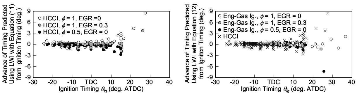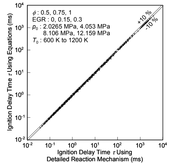 桑原(1)はノッキング予測モデルの開発について発表した。発表者がこれまでに構築した予測式では圧力が6MPaを上回る領域では着火遅れ時間を精度よく予測できなかったが、その領域にも適用できるように予測式を改善し、その結果予測値と詳細反応機構から得られた着火遅れ時間との差を±10%に抑えることができた(図1)。高圧側に適用範囲を拡大することで、高圧縮比エンジンや過給エンジンへの利用が期待できる。また、反復計算が不要な誤差補正を予混合圧縮着火とエンドガス自着火それぞれに設定して用いることにより予測誤差を低減できた(図2)。