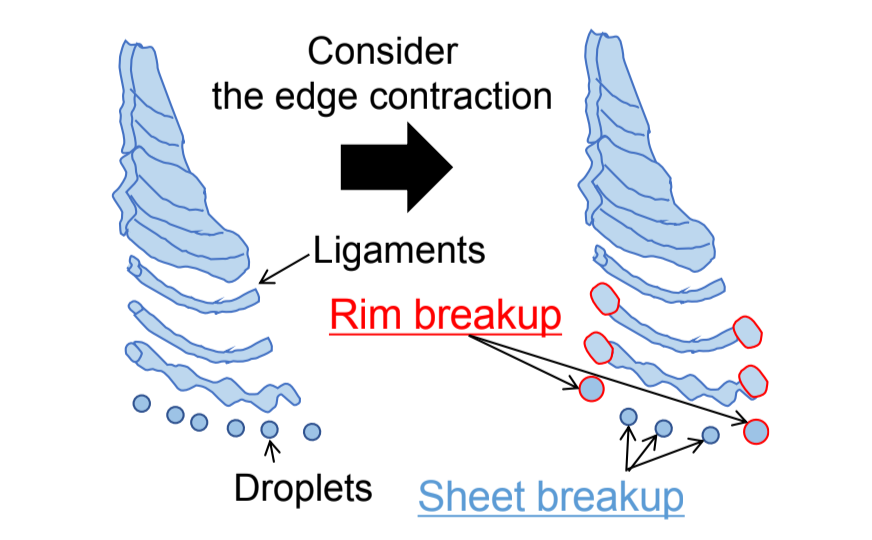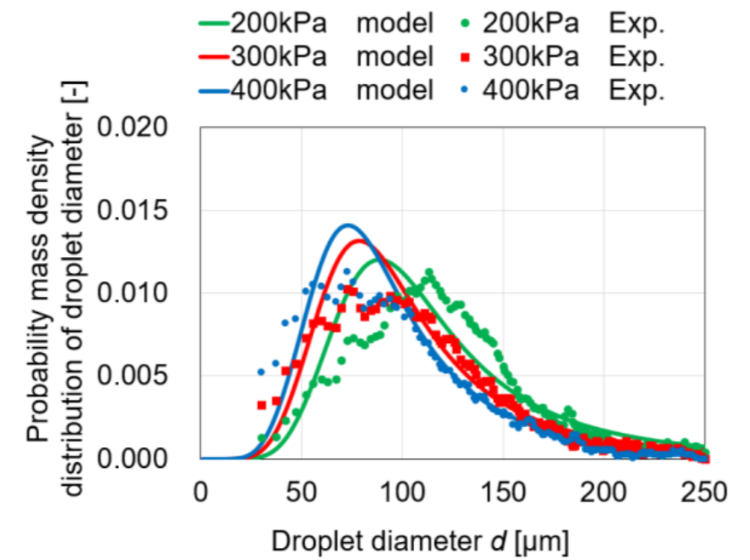 西村ら(2)は吸気管噴射用マルチホールノズルから噴射される燃料噴霧の噴霧分裂モデルを開発した。噴霧液膜から分裂した液糸がさらに分裂して液滴を形成する過程に注目し(図3)、液糸端面から分裂して生じる液滴の径が液糸の他の部分から生じる液滴の径よりも表面張力の作用によって大きくなることを考慮したモデルを構築した。モデルによる計算は液滴の粒径分布の実験結果を再現することができた。また噴射圧を変化させたときの粒径分布への影響を再現することができた(図4)。