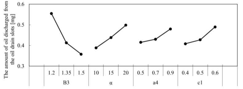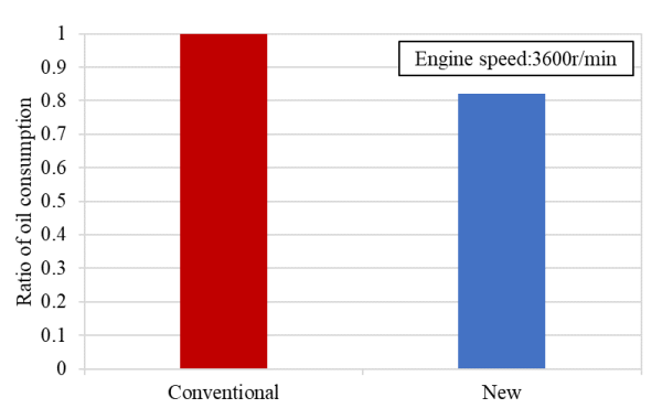 ディーゼルエンジンのオイル消費量を低減するためにオイルリングの面圧を上げるとフリクションが悪化する。阿部ら(1)はCFD解析と実験計画法を用いて2ピースオイルリングの形状を最適化することによってこの問題の解決を図った。L9直交表を使って設定したリング断面形状に3Dモデルによるシミュレーションを適用してピストン下降ストロークを模擬し、要因効果図からオイル消費に対して最も重要な寸法を見出した(図1)。この知見を基に設計した新形状のオイルリング(図2)周りの油量を可視化試験で評価し、シミュレーション結果と近い結果を得た。実機評価の結果、新形状のリングは従来形状に対して全負荷条件でオイル消費を20%低減できた(図3)。