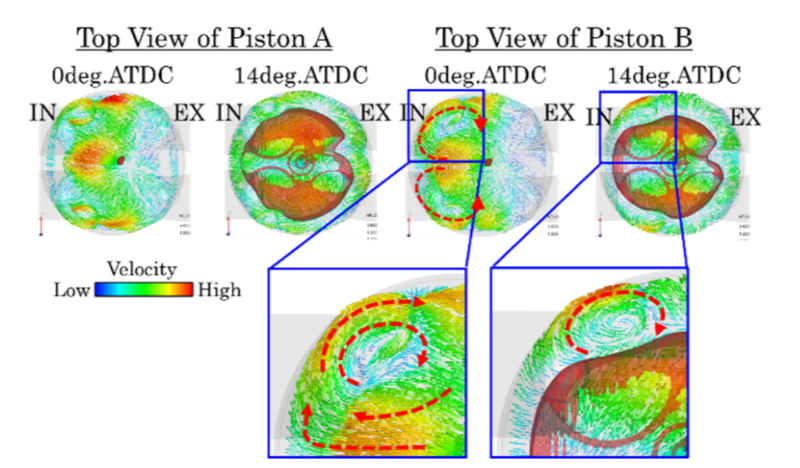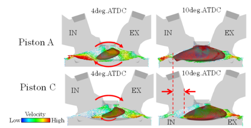 ノックの抑制策として行われる吸気のタンブル流動強化は、組み合わせる燃焼室形状によっては期待した効果を出せない場合がある。黒木ら(2)はピストン上面の形状に3D燃焼シミュレーションを適用し、燃焼中の流動が燃焼と火炎伝播に及ぼす影響を把握しようとした。シミュレーションモデルは常用に近いエンジン運転条件に適用できてかつ短時間に計算できることを目標に開発した。シミュレーションの結果に現れた吸気バルブリセス部に生じたω型の渦(図4)が火炎伝播を邪魔していることと、点火位置近傍のタンブル流れ(図5)が火炎伝播に影響していることに着目して、それらの指標を数値化した。得られた知見を基に改良したピストンでは、最大効率点近傍で燃費を2%改善できた(図6)。