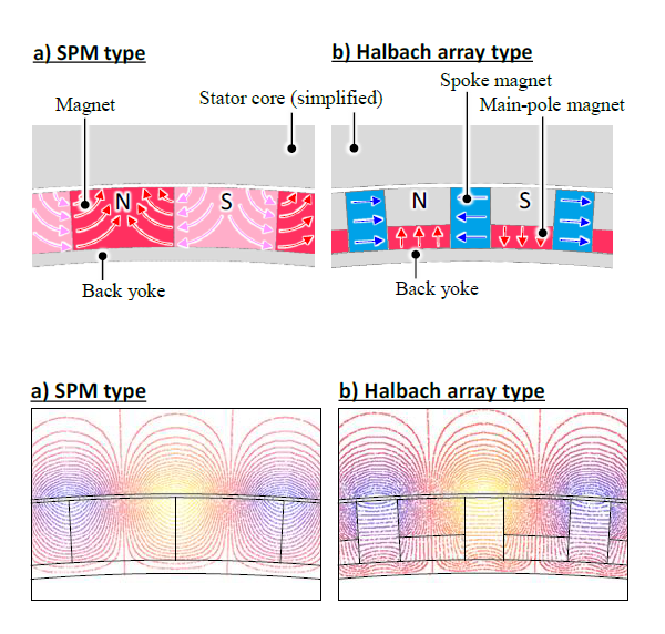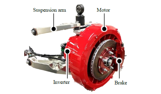 インホイールモータに、モータの効率と出力密度で有利な高速回転の小型モータを採用する方法は、大幅な減速が必要であるので減速機込みのサイズ・重さの点で課題となるが、髙トルクモータで直接駆動する方法では、要求トルクの面から枠の大きなモータが必要となる。伊藤ら(1)は、ロータの磁石配置を図1左の通常の表面配置(SPM)から、磁石の磁路長が短く磁束密度が高いHulbach array型(図の右側)に変更することで、コンパクトで実用的なセットを実現した。外観は図2に示すとおりで、インバータとモータ(いわゆるElectric Drive)が19インチホイールに入るサイズで、ブレーキやサスペンションは従来のものを使用できる。ベンチテストの結果、最大出力60kW、最大トルク960Nmを確認しており、最大出力時の出力密度は2.5kW/kgを確保している。