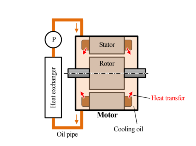 集積度が高いこともあって、モータ・インバータの冷却は重要かつ難しい課題である。須藤ら(2)は、一般的な油滴や攪拌による油冷ではなく、図3に示すいわゆるドブ漬けの油冷システムについて紹介した。車体側に設置された油圧ポンプで送られた油でインバータを先に冷却し、次にモータ部分を環状流路で均一に冷却した後、車体側の熱交換器に戻るもので、制動時のブレーキディスクやキャリパの熱からロータの磁石やインバータを守ることも考慮した冷却となっている。ベンチテストの結果、ポンプの油量制御で温度管理が可能と読める特性が明らかになっており、冷却能力も十分であることを確認している。今後、性能検証を継続するための試作EVも用意されている。