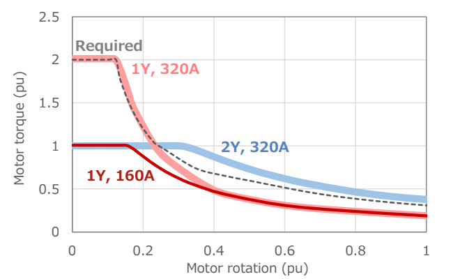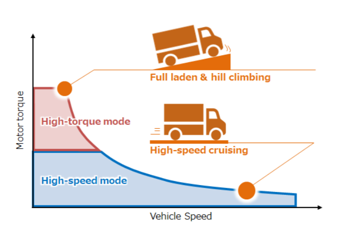高橋ら(3)は、大型EVトラックには図4に示すように高速走行での髙効率要求を満たした上で、積載時の登坂に大トルクが必須であることが変速機の併用を必要としているとし、図5に示すようにフィールド巻き線を2分してこれを直/並列接続に切り替えることで、高速走行時の効率をそのままにして低速時に髙トルクを発生する方法を紹介した。機械的接点によるこの切り替えは、接点の寿命の点で現実的でなかったが、開発した1極について多点でコンタクトするマルチコンタクト接触子によってこれを可能とした。低速での必要トルクを基準にしてモータを設計する手順をを述べ、これによって得られたモータの特性を例示している(図6)。これによって、モータ体格を大きく低減でき、駆動システムの小型化を実現できるとしている。