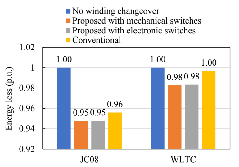 竹内ら(4)は、このモータの電費について検討した結果を紹介した。ⅰ)フィールド切り替え機能のないもの、ⅱ)開発した機械的SWによるもの、ⅲ)電子SWによるもの、ⅳ)コンベンショナル(電子SWによりフィールドが2倍に変化する)の4種について、JC08とWLTCのモード走行時の電費を計算した。結果は図7に示すとおり、あまり差がなく、特にWLTCではほとんど差がない。この点は、フィールド切り替えが、低速域ではフィールド抵抗が4倍になるので損失も増加することを理解したうえで、必要が生じた場面で、同じ体格のモータで十分なトルクを確保することが目的であるので、モード試験で電費が悪化しないことが成果であるといえる。
