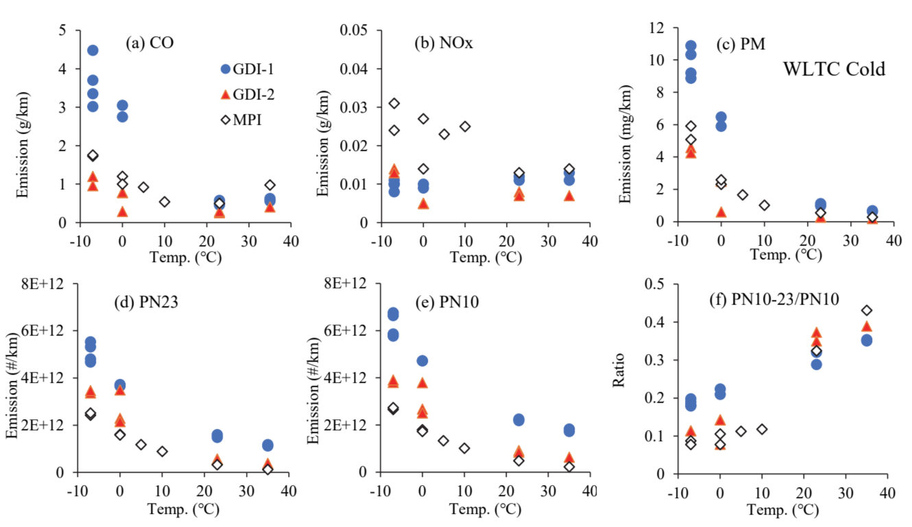 図1(d)は、3台の試験車における、気温を変化させたときのWHTCにおける各種エミッションの排出量を比較したものである。NOx排出量は比較的温度影響が小さいのに対し、COやPM、PNは低温で大きく増加する傾向を示した。この図でとくに興味深いのはSPN10-23で、PN23 (23nm以上の粒子)およびPN10(同10nm以上)それぞれを測定する粒子数カウンターを併用したことで粒径10nmから23nmの粒子数を算出したものである。これをみるといずれの車においてもSPN10-23は低温では排出割合が小さく、温度の上昇に伴い排出割合が増加する。PN排出がCOと相関が見られることおよび低温で増加する理由の考察として、空燃比も含めた時系列データの測定結果から、とくに低温時に始動直後の限られた時間においてエンリッチ制御が行われ、その部分での排出によるものと考察している。また、その部分でのPN増加について、既述の通り低温時のPN排出増加はPN23の増加が主であることから「すす」が主成分であるとしている。