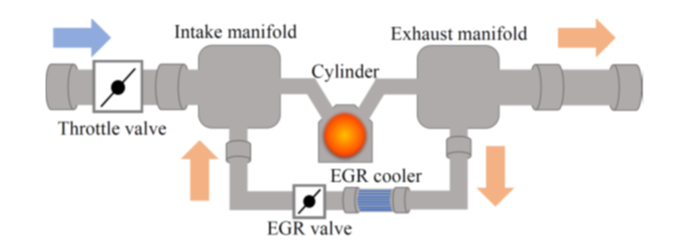 内燃機関において、排出ガス低減と燃費の向上の両立は不可欠となっており、この要求に対応するため、ガソリンエンジンにおいても、排気ガス再循環(EGR: Exhaust Gas Recirculation)システムの導入が進んでいる。EGRシステムは図1に示すように排気の一部を吸気に還流するシステムであり、窒素酸化物やポンピングロスの低減、ノッキングの抑制に有効である。しかしながら、排出ガスによるデポジットによって制御対象の特性にバラツキが生じるため、その影響を抑えた制御が望まれる。そこで、本研究ではEGRシステムのバラツキを機械学習手法の一つである異分散ガウス過程回帰(HGPR: Heteroscedastic Gaussian Process Regression)(2)によってモデリングし、その影響を低減するように制御を行う方法を提案した。(1)