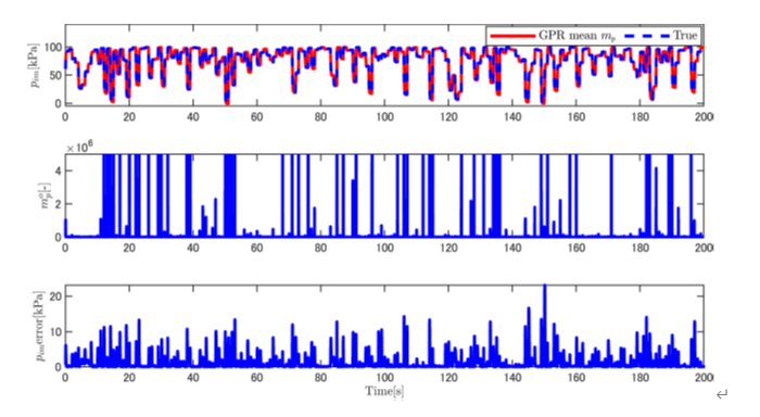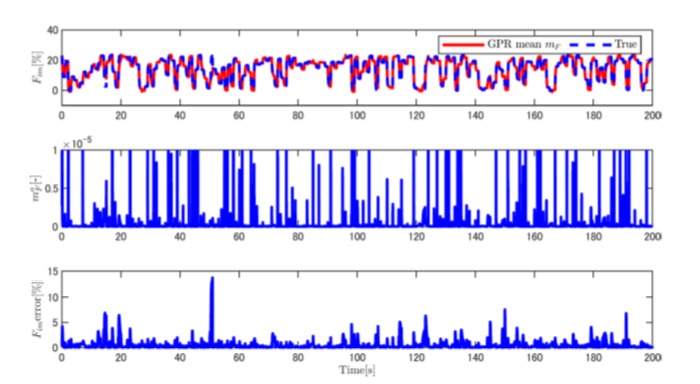 図1に示すガソリンエンジン吸排気系において、スロットルバルブとEGRバルブの応答は一次遅れ特性を持ち、その時定数がノミナル値0.05sに対して0.04s~0.1sの間でバラツキを持つと仮定する。そして、このバラツキを含む学習データを作成し、インテイクマニホールド圧力(以下、インマニ圧力)pimと、インテイクマニホールド内酸素濃度(以下、インマニ内酸素濃度)Fimを推定するHGPRを別々に構築した。各バルブを1s周期でランダムに動かした時に、出力の平均とバラツキをHGPRで推定した結果を図3、4に示す。図3がインマニ圧、図4がインマニ内酸素濃度を表し、両図は上から順にHGPRが推定した平均値(GPR mean)と真値(True)、HGPRが推定したバラツキ、推定誤差となっている。これらの図から、出力の時間変化が大きいところで、中段に示すバラツキの量が大きくなっていることがわかる。つまり、出力が速く動くとバラツキの影響が大きくなることを表しており、時定数にバラツキを持つことと整合する。