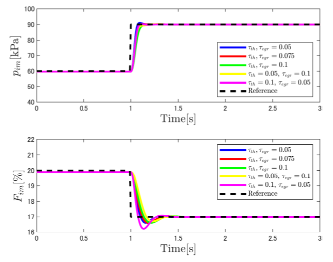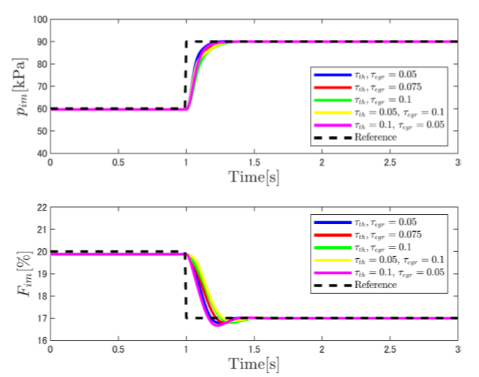 構築したHGPRを使ってモデル予測制御(MPC: Model Predictive Control)を行った。MPCは、現在時刻からH秒先の区間(予測ホライズン)の挙動をモデルによって予測し、その挙動が最適となるように制御を行う方法である。ここでは、予測にHGPRを使い、予測ホライズンを0.2秒とした。各バルブの時定数の組み合わせを5通り用意し、それらに対してMPCを行った結果を図5、6に示す。ただし、図5はバラツキの影響を考慮せずに制御したとき、図6はバラツキの影響を抑えるように制御したときの結果である。また、各図において上段はインマニ圧、下段はインマニ内酸素濃度を表す。図5に比べて図6の応答は、ステップ応答の立ち上がりが若干遅くなっているものの、応答間のバラツキが低減されていることがわかる。