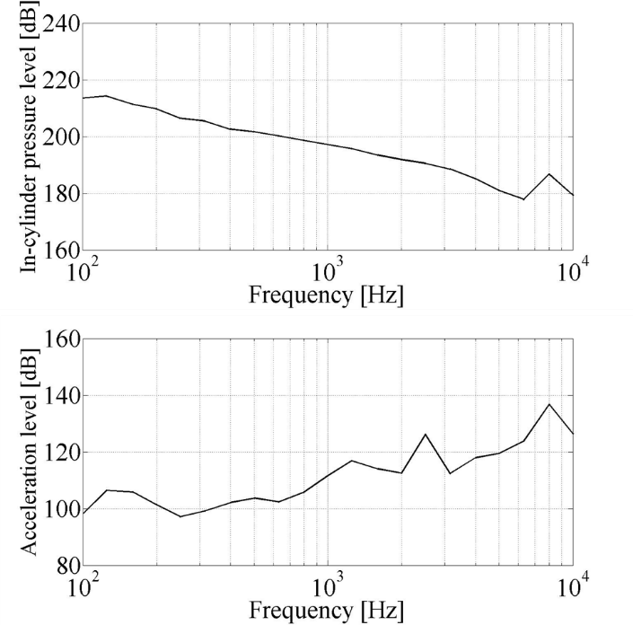 図1の筒内圧力と燃焼室近くの壁面の振動加速度の高速フーリエ変換(FFT)による結果を、図3に1/3オクターブバンド表示で示す。筒内圧力では8000Hzにおいて特徴的なピークが見られた。これは燃焼室内共鳴によるものと考えられる。振動加速度では2500Hzと8000Hzで特徴的なピークが見て取れた。三上(2)は本研究で用いたエンジンは2500Hz付近においてピストン―コンロッド連成振動数を含む固有振動数を持ち、騒音スペクトルにおいてピークを示すと述べている。よって、2500Hzのピークはこのピストン―コンロッド連成振動によるものと考えられる。