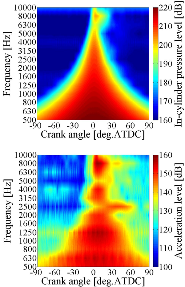 FFTでは欠落する時間情報も含めて解析を行うためウェーブレット変換による時間・周波数解析を行った。結果を図4に示す。筒内圧力は0deg.の上死点付近で全周波数においてピークを示す。ただし、8000Hzでは燃焼室内共鳴により20deg.ATDCまで大きい値が続いている。振動加速度ではほとんどの周波数において0deg.を過ぎたあたりでピークをとり、時間とともに減少する。時間・周波数依存騒音発生モデル(3)によれば、燃焼衝撃パワーは燃焼期間に構造内に振動エネルギーとして蓄積され減衰するが、ここでも同様の傾向を示している。これに対し、2500Hzでは40deg.ATDC付近に遅れてピークが見られた。