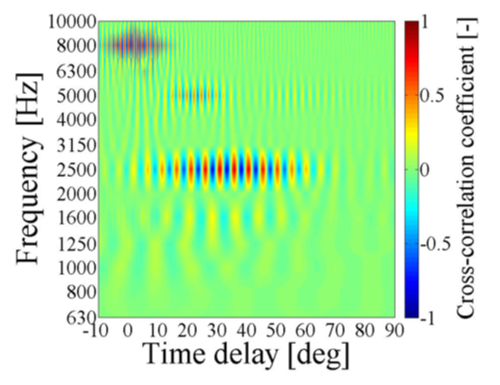 図4の振動加速度のうち燃焼起因の周波数成分を見出し、その伝達経路について考察を行うために、筒内圧力と振動加速度に対してウェーブレット相互相関解析を行った。結果を図5に示す。カラーはウェーブレット相互相関係数を表し、横軸は各周波数における筒内圧力から振動加速度の時間遅れをクランク角度で表示したものである。これより2500Hz、5000Hz、8000Hzで比較的大きな相関が見て取れる。8000Hzではほぼ時間遅れがなく、最短経路で振動が外壁面に到達したと考えられる。2500Hzでは30deg.程の遅れがあるが、これはピストン-コンロッド連成振動の励起遅れを伴って振動が到達したためと考えられる。