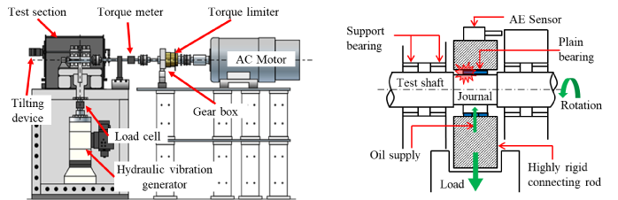 試験には図1に示す軸受試験機を用い、一対のアルミニウム合金製半割すべり軸受と、一つのジャーナル部を有する鋼製試験軸の組合せで実験を行った。コンロッドは剛体化することで、変形等の影響を極力排除し、ジャーナル部と軸受間の現象を明確化している。試験軸の駆動はモータで行い、トルクメータにより発生する軸トルクを計測した。試験軸は四つの支持軸受で保持し、潤滑油はコンロッド下部からの供給とした。また、供給油温は110℃とし、SAE粘度グレード0W-20の汎用エンジン油を用いた。さらに、焼付き発生時にジャーナル軸受間で発生する現象を分析するため、計測した波形を周波数解析することで摩耗形態が識別可能なAEセンサをコンロッド上部に設置した。