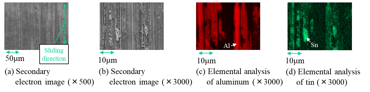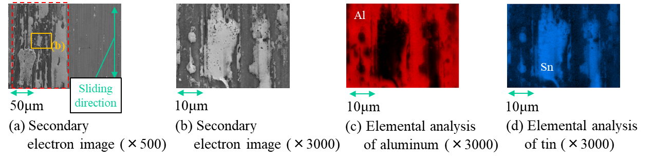 図4に焼付き後の鋼製ジャーナル表面の二次電子像及びEDX分析結果を示す。図4(a)の赤枠部は表面の移着物の拡大で、この移着物は摺動方向に広がっていることが確認された。図4(b)はこの拡大部であり、さらにEDXでこの部分を分析すると全面に軸受材料であるアルミニウム(図4(c))が確認された。また、アルミニウムが存在しない部分にはスズ(図4(d))が塊状に移着していることが分かった。図5はトルクスパイク発生後の観察及びEDX分析結果で、焼付き後よりも少量のアルミニウムとスズの移着が確認された。一方、いずれの場合もスズは再表面に塊状に移着し、焼付きやトルクスパイクの発生時には摩擦熱による半溶融状態にあることが推察される。以上より、スズは焼付きへの関与はなく、焼付きはアルミニウムと鋼製ジャーナルの凝着量の増加に影響されると考えられる。