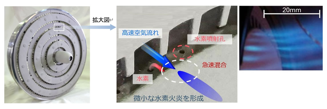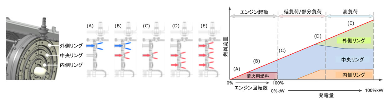 図2にM1A-17型ガスタービンエンジン(1800kW発電出力)と試作燃焼器、micro-mixバーナモジュール背後に形成される水素火炎をそれぞれ示す。本試作燃焼器のmicro-mixバーナモジュールでは、水素噴射孔の直径は0.8mm、その個数は410個、また水素を供給するリング部品を3個備えている。図3にガスタービン運転時の燃料供給を示す。エンジンの起動(図3AとB)、低負荷運転(図3C)、部分負荷運転(図3D)、高負荷運転(図3E)のそれぞれで水素を供給するリングの数を切り替える。この燃料ステージング方式により、低負荷から高負荷運転での安定燃焼と低NOx運転を実現する。