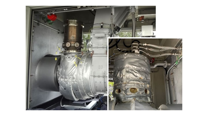 図4に神戸市のポートアイランドに設置した水素コージェネレーション実証設備の全景を示す。当社のPUC17型常用発電装置を使用し、M1A-17型ガスタービンエンジンを装備した。2017年12月の設備完成以降、従来型の燃焼技術であるウエット方式を用いて、ガスタービン発電装置単独での試運転や、天然ガスによる運転試験を経たうえで、水素と天然ガスの混焼および水素専焼による熱電供給の実証試験を実施した。2018年4月19日と20日に実施した実証試験において、水素のみを燃料として、近隣の4施設への熱電の同時供給を実現し、市街地における水素ガス専焼のガスタービン発電による熱電供給を世界で初めて達成した(5)(6)。