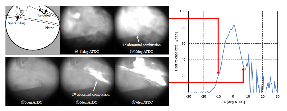 曾(1)らは、過給ガソリンエンジンにて高回転高負荷運転時に散発的に発生する高速ノックの発生要因を明らかにした。高速ノックの発生サイクルでは、2回の異常燃焼が発生しており、2回目の異常燃焼によって強い圧力振動が誘発されることを見出した(図1)。この2回目の異常燃焼はピストンクレビス付近や燃焼室内の排気バルブ付近に分布していることを、多点圧力解析と高速写真から解明した(図2)。