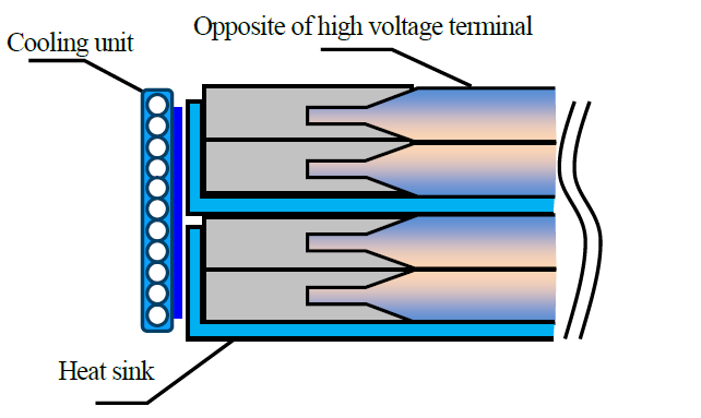 軽自動車EVは主な使用目的が都市内利用であるので、重量増による電費悪化と車室空間を考慮して、現実的な電池容量にとどめる必要があるが、たまに必要となる長距離走行が難しいことがネックとなる。千葉ら(1)は、小容量電池で長距離移動を可能とする実用的な手法として、走行/急速充電の繰り返しによる電池の蓄熱を抑止する電池冷却方法と、発熱を抑制出来る急速充電方法について述べた。一般的な電池パック底部の冷却ではパックの上部の放熱が不充分で高温になり充電電流の抑制が必要となる。そこで図1のようにラミネートセル2枚毎に銅製放熱板を設け、端面(高圧電気端子のない片面のみ)に設置した冷却ユニットで放熱することで、均一な放熱を可能とした。この放熱能力で、100km/hで充電警告灯点灯時まで走行後、30分の充電を繰り返した際の温度制約を加味した充電電力量を50,40,30kWの3レベルの充電で模擬した結果、30kWでの充電が繰り返し充電でも影響がなく実用的であるとしている。シャシダイナモメータ上での走行/充電の繰り返しの結果で電池温度も安定していることを確認している(図2)。