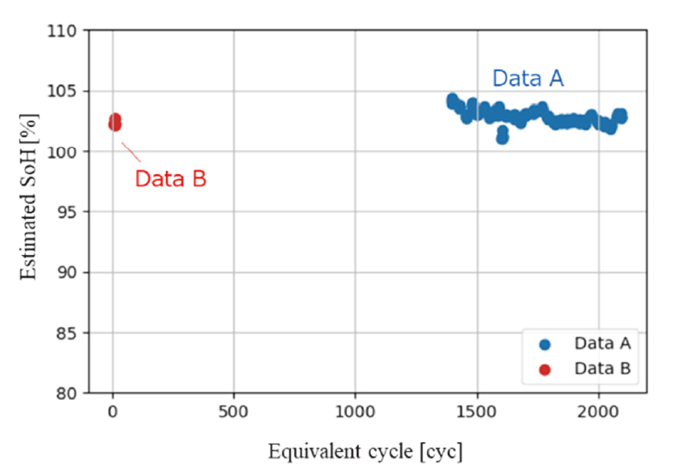 Bが新規)。同一の電池モデルによる推定にも拘わらず、新しい組電池のSoHの方が低くなった原因について、電池温度の測定点の不適によって実温度が反映されていない可能性があるとしている。同一のシステムでの比較では問題ないものの、異なるシステム間の比較の成否を左右する正規化方法等は今後の課題である。