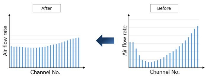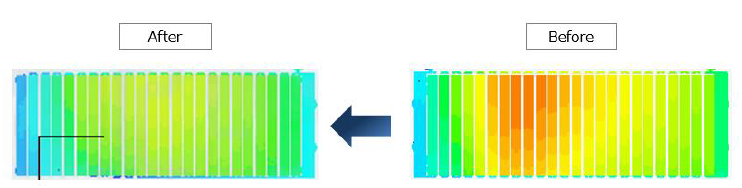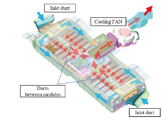 HEVで一般的な、空調された車室の空気で電池を空冷するシステムでは、ブロアを排風側に設けて車室内の騒音低減を図る例が他のセッションを含めて3件あったのは興味深い。このうち村田ら(4)は、コンパクトさを要求されるHEVの電池パック(図4)のこの空冷方法で、各セルの温度を均一にする方法として、セル間の流路口の面積を調整して圧力損を平準化することで、配風のばらつきを70%から20%に削減し、温度を均一化した(図5)。なお、このセル間距離は、電池劣化によるセルの膨張も考慮して決定されている。