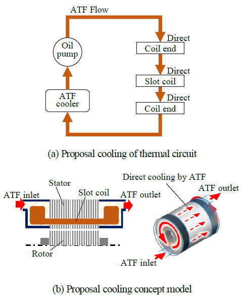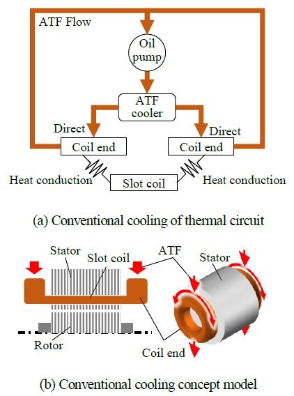 電動車の大量普及時のモータでの材料資源の削減を目的に、希少鉱物に留まらず銅や電磁鋼板などの有効利用目的の小型化の発表があった。上田ら(1)は、トルク密度、出力密度の向上によって40%の小型化を図ったモータを試作した。小径のロータでマグネット、リラクタンス双方のトルクを最大限利用するため、磁石埋め込み型同期モータ(IPMSM)の磁石も図1(b)の様に円弧型を採用し、従来の(a)より9%のトルク向上を可能としている。電流密度の増大で同等の出力確保に発熱量が増大するが、コイルエンドに冷却媒体を滴下していた従来法(図2)を、コイル部全体を密閉構造として、冷却媒体液を一方のコイルエンドから反対側に強制的に循環する方法(図3)に変更することで2倍の冷却能力を実現している。この結果、体積で40%、質量で27%低減したモータで目的の特性を確保出来たとしている。
