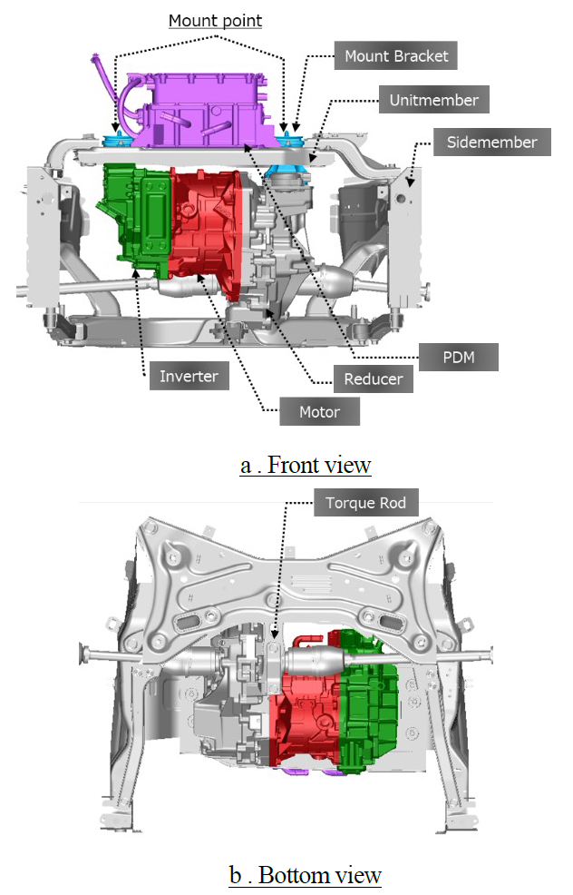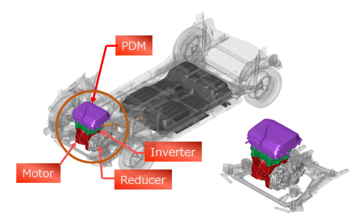 赤羽ら(2)は、軽乗用BEVの実用的なパワートレインとして必須のスペース効率の向上と、無駄を省いて効率を向上させる簡略化について紹介した。従来車でモータ・減速機の上にインバータ、その上にパワーデリバリーモジュール(PDM)を積層した(図4)のに対し、インバータ、モータ、減速機を直線上に一体化しこの上部にPDMを配置している(図5)。モータとインバータ/モータ制御ユニットを一体化し、容積が30%減少しただけでなく、冷却システムの一体化、三相バスのケース内完結・短縮によるロスの低減・強電ハーネスがないことによるEMCの大幅な改善が図られている。軽自動車はクラッシャブルスペースが小さいため、駆動系のマウントの工夫で,衝突時には減速機のマウントを起点にモータ類が回転・移動することによりモータ類の車室内食い込みと駆動用電気系の破損を低減する方法が採用されている。