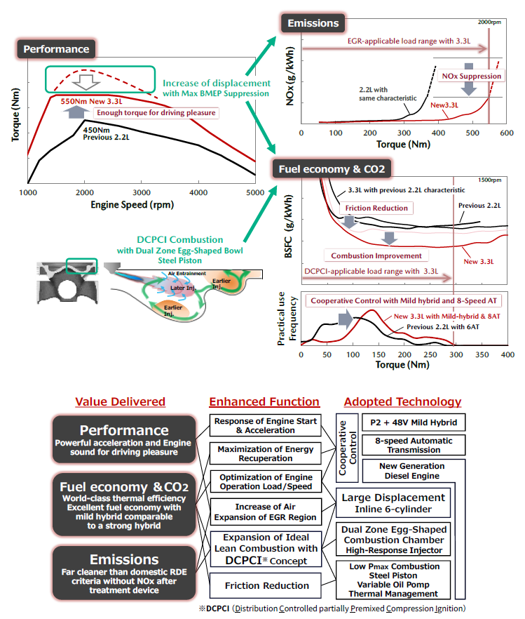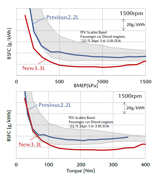 志茂(マツダ)ら(1)は新世代3.3Lクリーンディーゼルエンジンの開発(第1報)と題して、本エンジンの技術開発コンセプト(図1)の説明を行った。ディーゼルエンジンの2nd Stepとして、新開発2段エッグ燃焼室を用いた、空間制御予混合燃焼DCPCI(Distribution Controlled partially Premixed Compression Ignition)によってPCI領域を拡大している。そして乗用量産ディーゼルエンジンで、世界トップの燃費率BSFCを達成した(図2)と報告があった。またこの講演に続き(第2報)(2)では、本エンジンと48Vマイルドハイブリッドおよび8速オートマチックトランスミッションとの協調制御について報告、(第3報)(3)では、軽量、低機械抵抗、低振動と高い信頼性の実現について報告があった。