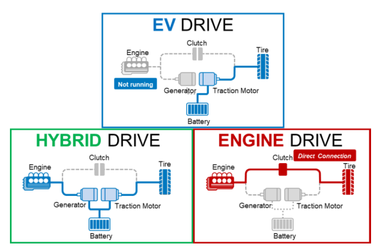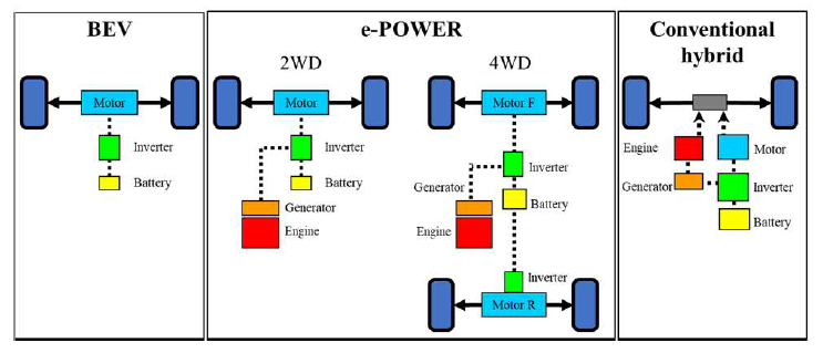長谷川ら(1)は、典型的なシリーズハイブリッドの図1中央のモードのSUV用のパワートレインについて紹介した。駆動はBEVに準じてモータのみで充分な、余裕のある大きさのモータを採用している。ターボ付きエンジンの採用によって、低回転数域からの発電を可能にしたことで、エンジン音が静粛となったが、更に、ロードノイズの少ない低車速域での発電を避けることで実用面で高い静粛性を確保している。速い発進加速や追い越し加速での発電時のエンジン回転数を、車速に沿って上げる制御でダイレクトな加速感を実現している。シンプルなHEVであるので、モータとエンジンの使用域の制限が少なくなったことによって、複雑な制御なしに効率化も図られている。