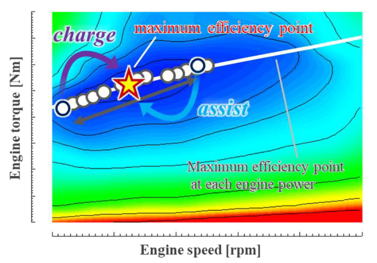 古畑ら(2)は、シリーズハイブリッドにエンジンと駆動軸をロックアップクラッチで直結する機能を設けた図2のHEVシステムについて実施したコンパクト化と高効率化について紹介した。エンジンはストイキ領域の拡大を図る種々の対策により、図3に示すように燃費良好な範囲を拡大した。本来、エンジン直結のエンジンドライブ時は、その回転数で効率最大になるよう に駆動モータでトルク吸収/アシストを実施して最大効率線をトレースする制御であったが、拡大した燃費良好範囲で電池のアシストや電池での吸収を抑える方向(電気系のロス低減)にエンジン動作点を各々シフトすることにより、直結モードでの効率を2.4%改善している。従来、発進加速や追い越し加速での発電時には、エンジンが最高効率点で動作するように制御されてきたため、加速初期から高い回転数に維持され、ドライバーの感覚に合わなかったが、この拡大された燃費良好範囲内でエンジントルクの増大(結果、エンジン回転数up)を繰り返す方法で、変速機によるエンジン回転数変化に似た感覚にマッチした加速状態を実現している(詳細は(2)参照)。