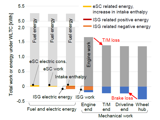 前述の3件は、いずれも長い経験の下に導かれた成果であるが、これに対し新たな組み合わせのHEVの成立性には的確なシミュレーションが有効である。水嶋ら(4)は、システムのエンジンへの依存度が高く、電動過給器の利用が一般的な低電圧マイルドハイブリッドについて、複合的な物理領域(マルチドメイン)で構成される系に有効なモデリング言語を利用したモデル化手法を提案し、シミュレーションによる性能解析の可能性について紹介した。既発表のエンジンサイクルモデルをベースにした過給器付きモデル、ISGモデルと車両モデルを作成し、WLTCモード試験の結果例(図6;この例では最終的に回生されるエネルギーが数%にとどまる)を紹介した。研究者が、提案する種々のシステムを容易に評価できることを期待してオープンソフトのModelicaを採用している。