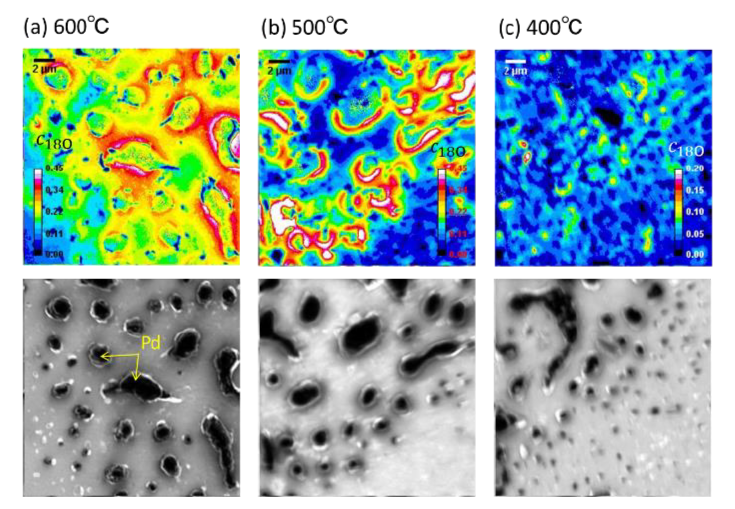 (1)いずれの温度においてもPdを起点に酸素が吸蔵されるが、低温ほど吸蔵領域が狭くなる(図1)。