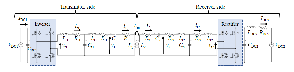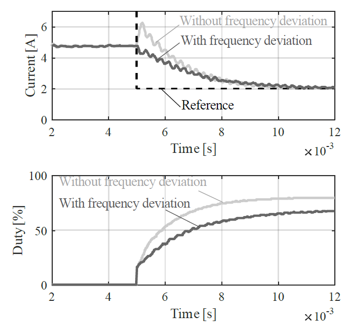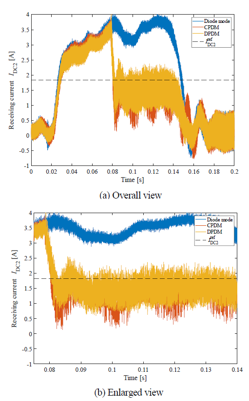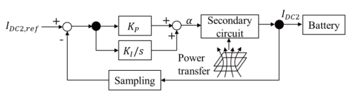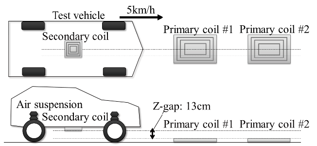 池村ら(2)は、電力調整をPWM(パルス幅変調)による方法に関して、路上に2個の送信側コイルを置き。市販HEVに停車中充電用の規格、SAE J2954のWPT1-Z3にそって製作したコイルを設置した図1(a)に概要を示す試験設備で、極低速で動作確認を行った結果を述べた。制御は目標充電電力に一致するように電池電流値をフィードバックする(図1(b))。試験の結果、ステップ入力に対してフィードバック制御に起因するとは考えにくい過応答が見られ、この原因を調査した結果、共振点のずれやアクティブ整流の影響によると考えられる電流の位相ずれが原因と考えられるとしている。この解決策として、受電側のキャリア周波数を5%下げることで位相が順次変わる方法を提案し、シミュレーションにより、図2に示すとおりステップ入力に対する過応答を防ぐことが出来るとしている。