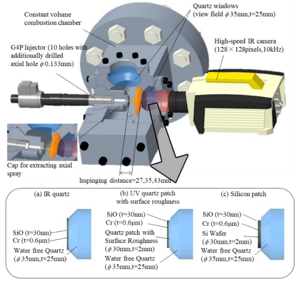 木下ら(1)は燃焼室壁面へ衝突する火炎の熱伝達現象を時空間的に解明するため、定容容器を用いて可視化試験を実施した。クロム放射膜を施した石英ガラスに火炎を衝突させ、クロム膜からの赤外放射を火炎衝突面の裏面より高速度赤外線カメラにて撮影した(図1)。観察用に加工してある衝突面と実際のピストン表面の違いを考慮するため、熱拡散率や表面粗さを実機のアルミピストンに近づけた単結晶シリコン窓も試験した。観察画像から、赤外放射は中心から筋状の広がりを示し(図2)、噴射、雰囲気条件違いで強度は違うものの、筋状パターン自体には差が見られなかった。試験条件が異なっても同一の筋状パターンが観察されるため、エンジン諸元や運転条件違いでもこのパターンは現れる可能性があり、壁面付近の流体の乱れの構造に起因すると示唆される。