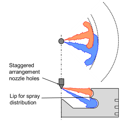 小川ら(1)は上下段にそれぞれ6孔を配置した12孔千鳥ノズルと、側面を上下段に分割した燃焼室を組合わせて(以下、上下分配型と記す)(図1)、エンジン試験を実施した。最適なノズルスペックは前報のCFD結果に基づき決定した。比較対象とした通常配置の8孔、12孔ノズルとリエントラント型燃焼室の組合せに対して、今回の上下分配型は図示熱効率向上(図2)と黒煙低減が得られた。熱発生を見ると、上下分配型は最大値が大きく、多噴孔の特徴である早期減少は見られずに後燃えが活発になっている。これらの良好な結果は、上下分配型による噴霧干渉の抑制にて得られたと示唆される。一方で、冷却損失の増加をCFDにより解析すると、今回は噴霧分配を重視して決定した上側噴孔の79°がヘッド側の損失を増加させているため、上下分配の最適化で改善が可能であることも分かった。