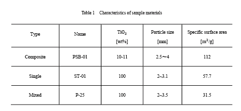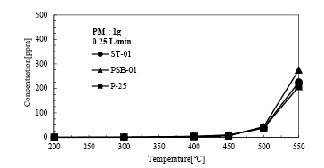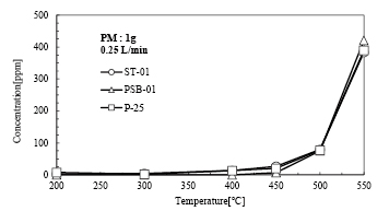 附柴ら(1)は貴金属材料に代わる触媒として、「酸化チタン」の熱励起触媒能に着目し、PMの酸化・分解の可能性を検討した。熱励起された酸化チタン粒子を用いて、PM中の固形炭素微粒子に相当する黒鉛(カーボンブラック)の酸化分解実験を実施。酸化チタンの配合量や粒径の異なる3種類のサンプル(表1)に対し、温度依存性、空気流量、黒鉛量が酸化分解効率に与える影響について検証した。ここでは温度依存性の試験結果を紹介する。図1、2は、空気流量0.25L/min、加熱温度200~550℃でのCO、CO2濃度の測定結果を示しているが、450℃以上の高温域でCO、CO2の濃度が増加していることから、酸化チタンが熱励起により黒鉛を酸化・分解していると言える結果が得られている。