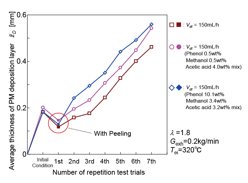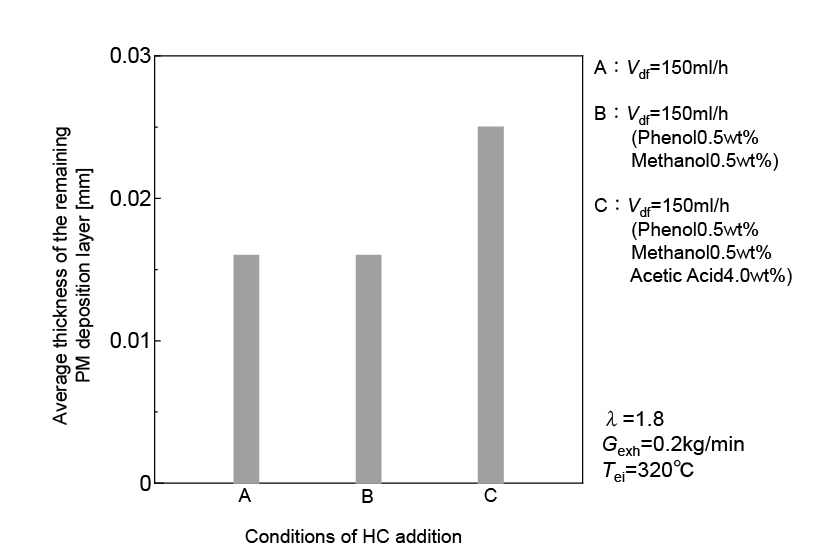 水村ら(2)は排ガス中のPMがEGRクーラの冷却壁面上に堆積することにより、冷却性能の低下が引き起こされる課題に対し、堆積したPM層の剥離特性の解明に向けた調査を行った。特に、固着力をもつデポジットについては炭化水素、酸類の存在下で生成される可能性が高いことから、軽油にフェノール、メタノール、酢酸を混合し、堆積試験を実施。図3は酸の影響を調査した結果を示しており、条件Cは軽油に酢酸が混合されたもので、残存したPM堆積層が最も厚くなり、酸により固着を促進させることを確認した。図4は炭化水素の影響を調査した結果であり、横軸が試験回数、縦軸がPM堆積層厚さを示している。凝縮水が発生するコールドスタートを含め、7回試験を実施した結果、フェノール、メタノールをより多く混合した場合は平均PM堆積層厚さが厚くなった。各成分が冷却壁面上で凝縮し、凝縮水により堆積層の成長が促進されたものと考察している。