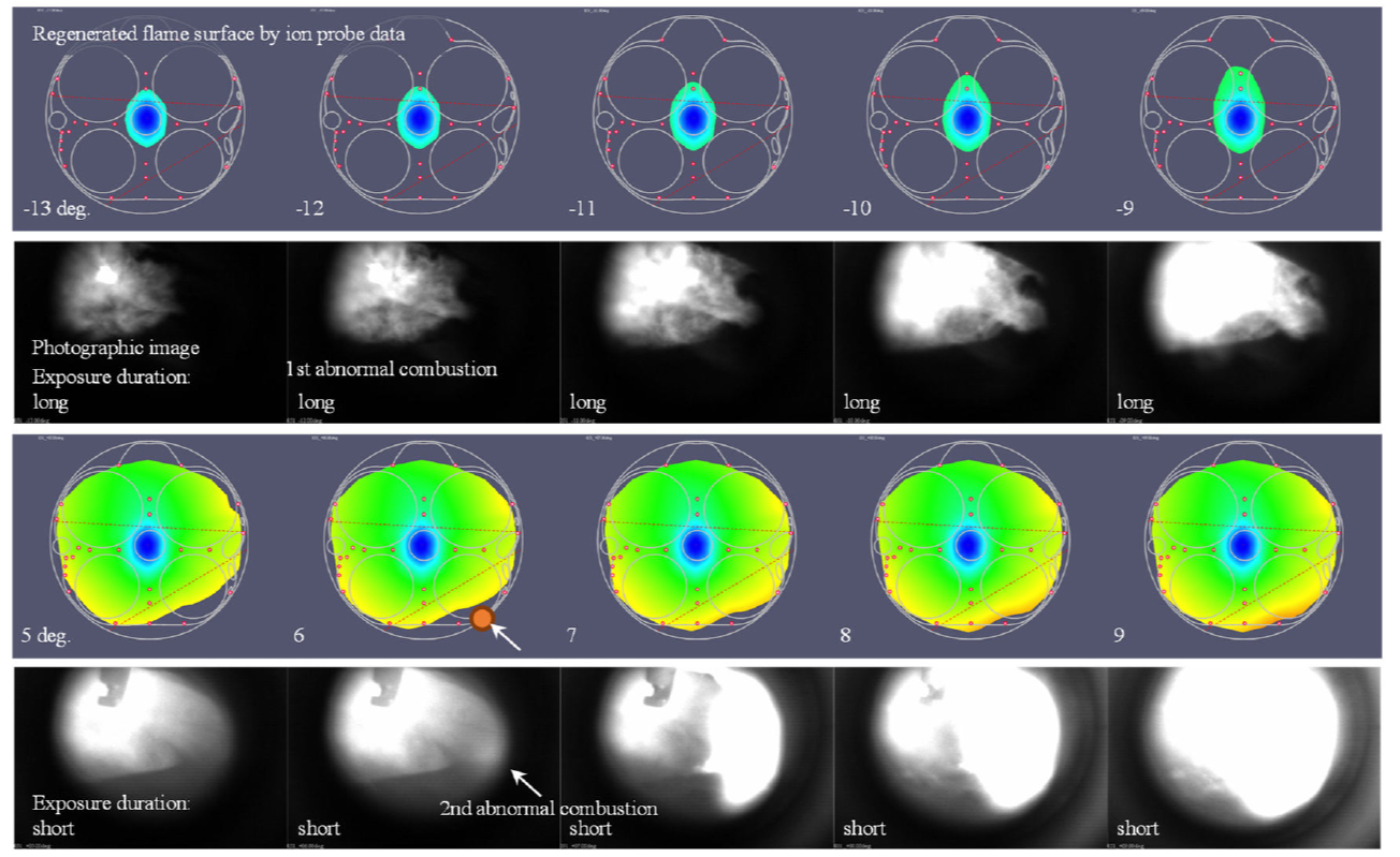 八房ら(1)は過給ガソリン機関において、高速高負荷運転時に発生する極めて大きな圧力振動を伴う異常燃焼(高速ノック)の発生原因を、可視化・圧力・イオンプローブ計測を用いて調査した。高速ノックが発生しないサイクルにおいても圧力振幅の小さい異常燃焼(第1異常燃焼)が起こっている。高速ノックサイクルでは、2回の異常燃焼が発生しており、2回目の異常燃焼によって強い圧力振動が誘発されているという。また2回目の異常燃焼は、未燃ガスの自着火であると考えている(図1)。RDE(Real Driving Emission)規制の導入により、エンリッチメントに頼らず、高速ノックを回避する技術が必要とされている。本研究で得られた知見は有益であると思われる。