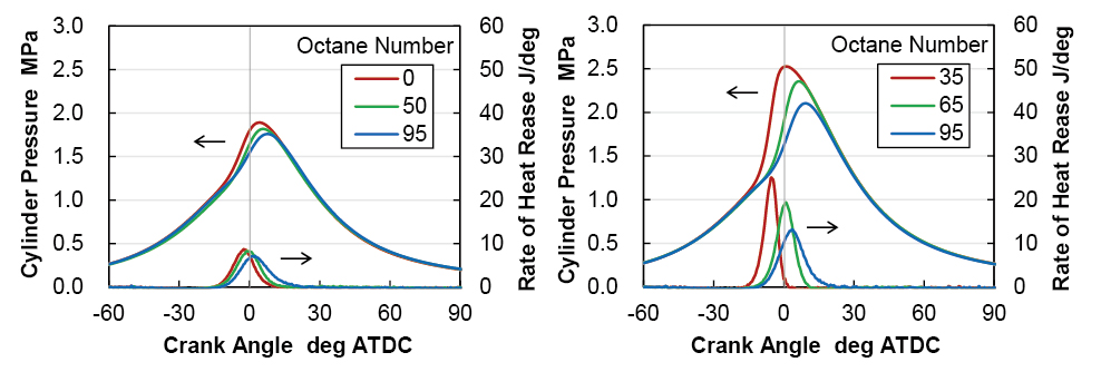 図2に、回転速度2000 rpm、当量比φ=0.68において、低負荷(掃気効率33%で残留ガスが非常に多い状態)および高負荷(掃気効率55%で残留ガスが比較的少ない場合)それぞれにおける、オクタン価を変化させた際の指圧と熱発生率を示す(燃料はPRFである)。いずれも低温酸化反応によるものと思われる熱発生は確認できない。また、特に低負荷時には、オクタン価を0から95まで変化させても、着火特性の変化がわずかであることが分かる。このように、低温酸化反応が極めて生じにくい条件においては、様々な着火性の燃料を同一の運転条件で運転できる可能性があることが分かる。
