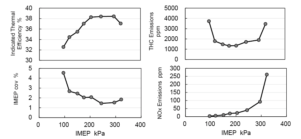 図3に、PRF50を用いた際の、負荷に対する図示熱効率、IMEPの変動率、THCおよびNOx排出濃度を示す。オクタン価が50と、SI機関に用いるには低すぎる値であるにもかかわらず、特に中負荷域において小型のエンジンの中負荷としては高い熱効率と、低いNOxを実現している。様々な燃料を受け入れる内燃機関技術という観点から、今後のエンジンとして有用な使い方だと考えられる。