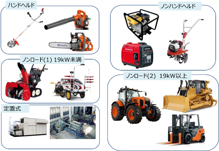 産業用エンジンは、サイズ・使用燃料・用途ともに多岐である(図1)。これらを大きく五つのカテゴリーに分類する。一番小さなものはハンドヘルドで、2サイクルガソリンエンジンが主に用いられ、手で持って作業を行う。ノンハンドヘルドは、持ち運びができるが、概ね据え置きが多い用途で4サイクルガソリンエンジンが中心である。ノンロードは農機・建機に代表されるもので、国の規制の有無で2段階に分類しており(19kWが境界)、主にディーゼルエンジンが用いられる。最後が定置式で、コージェネ・ポンプ場・非常用発電など、主にディーゼルエンジンとガスエンジンが用いられる。GHP(ガスヒートポンプ)用エンジンは定置用に分類している。