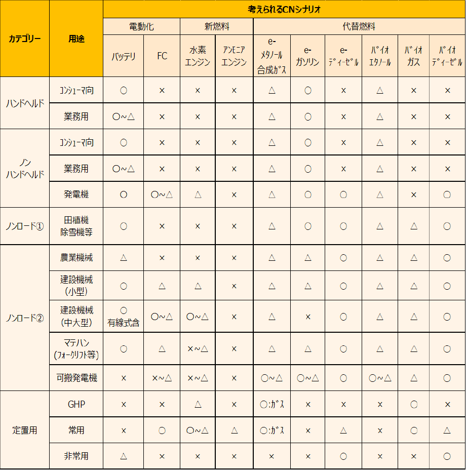 産業用エンジンは無くならない!ならどうする?電動化が困難な状況があるとは言え、CNに向かう必要がある。考えられるシナリオは、今のエンジンの優位性をそのまま保てる新燃料・代替燃料が中心になる。近年、バイオ燃料・e-fuel(H2とCO2から合成)・アンモニア・水素の直接利用など、多くの選択肢が提案され、研究開発がなされている(3)。そこで、現時点で前述の各カテゴリーにおいてどのような新燃料が期待されるかについて、産業用エンジンメーカーの技術者で議論を行いまとめた結果を表1に示す。燃料価格は不明な部分が多いが、基本的にDrop-in(そのまま使える)燃料であるe-fuelやバイオ燃料に大きな期待が寄せられていることが分かる。現時点では複数の選択肢があるが、今後絞られていくと考える。