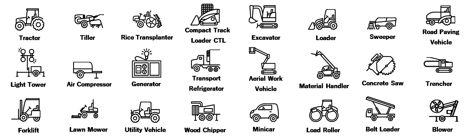 オフロードエンジンは、図1に示すオフロード機械のパワートレインとして使われている。これらの機械は、トラクタやエクスカベータなど、自走しながら作業を行うものから、発電機やコンプレッサなど、定置使用するものまで多岐にわたる。そして、必要とされる現場での作業が目的となるという点で、オンロード車両とは一線を画す。さらに、オフロード機械においては、使用環境や作業内容も様々である。 例えば、トラクタでは、農耕地での耕耘作業が一般的だが、市街地での除雪作業にも使用され、作業に応じたエンジン回転および負荷が要求される。一方、一定回転数で使用される発電機では、建設現場の動力源として24時間連続稼働されるものもあれば、病院などの非常用自家発電設備として有事の際のみ稼働されるものもある。