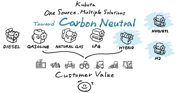 CN実現に向けて内燃機関を活用した三つのソリューションを示す。それは、既存エンジンのさらなる低燃費化を目指すピュアエンジンソリューション、電動モータも活かすハイブリッドソリューション、代替燃料を使用するフューエルソリューションである。ピュアエンジンソリューションの事例として、電子制御小型ディーゼルエンジンを挙げる。19kW以下のエンジンを電子制御化し、新燃焼⽅式TVCRを適用して排ガス低減と低燃費化を両立した。TVCRは、小型エンジン専用に開発された独自のコモンレールシステムとオリジナルのE-TVCS燃焼方式を組み合わせた技術を有する。また、ECUはエンジンへの直載を可能とし、搭載性を向上させている。