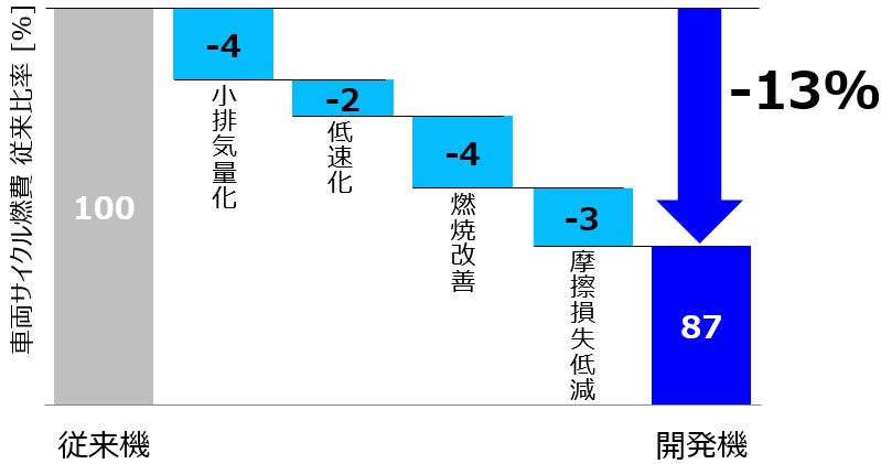 3D95エンジンでは大幅な燃費改善のため、図1に示す四つの燃費低減アイテムを織り込んだ。一つ、二つ目の項目はいわゆるダウンサイジングとして排気量を3/4とする一方で過給圧を1.4倍とし同一出力を保持しながら車両におけるエンジンマッチング回転を低速側に振ることでエンジン燃費効率の良い領域を積極的に使うことで燃費改善を行った。三つ目は燃焼筒内圧を30%向上させるとともに吸気流路の最適化を行った。四つ目はピストン・コンロッドをはじめとした往復摺動部分の設計見直しにより損失低減を図った。これらの改善により車両サイクル燃費としてエンジン単体で従来機比13%の低減を実現し、車両全体での従来機比28%の燃費改善に大きく寄与している。