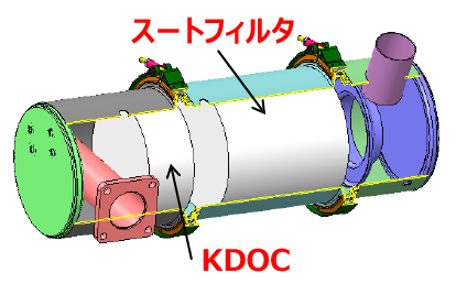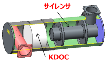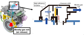 排出ガス規制対応技術本エンジンは日米欧向けであるが、欧州向けは排ガス中の粒子状物質の数量規制があるためKDPF(図2)を採用し規制に対応した。KDPF仕様ではエンジンオイルに含まれる金属成分が筒内で燃焼することによるアッシュのKDPFへの蓄積が課題であるためエンジン本体でのオイル消費低減をし、KDPFの交換インターバル延長も達成した。他方、日米向けには必要十分な排気ガス浄化性能および消音性能を持ったKDOCマフラ(図3)を採用しコスト競争力の確保にも配慮した。KDOC仕様ではブローバイガス中の粒子状物質(PM)の排出量コントロールが重要であることから高効率のブリーザ(図4)によりこの課題に対処した。